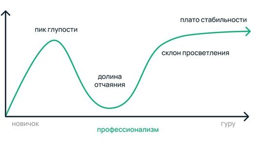 Есть такое когнитивное искажение, которое заключается в том, что новички чувствуют и ведут себя более уверенно, чем профессионалы. Говоря простым языком: «Дурак не понимает, что он дурак, потому что он дурак». По-умному это называется эффект Даннинга-Крюгера. И я наткнулся на удивительного человека, который олицетворяет «пик глупости» — сейчас объясню. На горизонтальной оси профессионализм, на вертикальной — уверенность. У новичка в каком-то деле уверенность растет быстро и, кажется, он уже понял и умеет все — это и есть «пик глупости»...