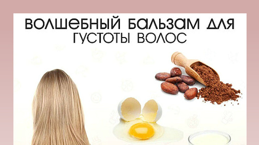 Красота Здоровье5 лет назадПодписатьсяВОЛШЕБНЫЙ БАЛЬЗАМ ДЛЯ ГУСТОТЫ ВОЛОС 👩🦳🌱🌺⠀ Очень эффективный рецепт для увеличения густоты волос и от выпадения. ⠀ ✅1. Перемешать полстакана кефира, 1 яйцо, 1 чайную ложку какао.
