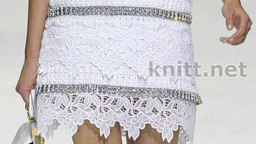 Вязать основным узором согласно выкройке. Платье состоит из отдельных 4-х деталей соединенных между собой декоративной лентой из камней. После выполнения деталей сшить детали чередуя с декоративной лентой. Внизу платья пришить кружево. Описание вязания...