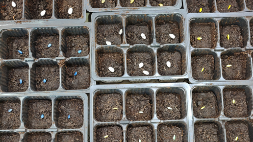 Вчера так сильно устала, что не успела Вам рассказать, что посеяла огурцы, дыни, кабачки и арбузы. Сеяла их в кассеты с 6 ячейками. В каждую ячейку по 1 шт. Семена не проращиваю, в грунт и воду ничего не добавляю...