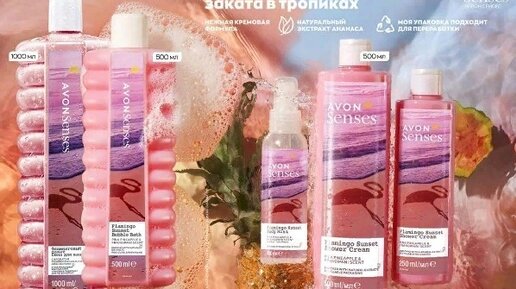 Всем огромный привет! Друзья, хочу поделиться отзывом на новинку гелей для душа от компании AVON, это крем-гель из серии Senses "Фламинговый закат". Данный крем-гель выпускается в обновлённой упаковке объёмом по 250мл. и 500 мл., с удобной крышечкой и красивым дизайном. У геля довольно густая консистенция розового цвета с перламутровым оттенком, он отлично пенится, достаточно не большого количества геля, это очень экономично. А какой шикарный аромат, это просто не передать словами. Гель идёт с ароматом розового ананаса и франжипани, с натуральными экстрактами...