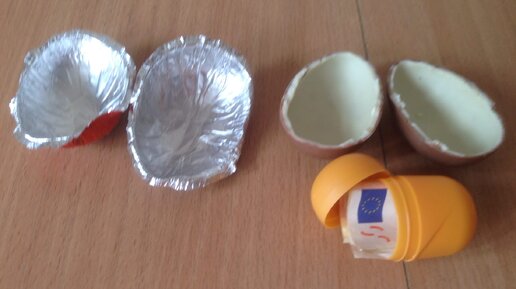 Если вы хотите сделать оригинальный подарок, то вот вам интересная идея. В Киндер можно положить, не только деньги но и кольцо или украшение. А если яйцо большое, то и подарок больше. Для начала нам нужно шоколадное яйцо. Его нужно открыть, как можно более аккуратно. Фольгу потихоньку открыть, не порвав её целостность. Шоколадное яйцо можно открыть руками, по шву. Но лучше всего это делать ножом, так получится аккуратнее. Достать фигурку из желтка. Теперь можно запаковывать наш подарок. Как пример у меня 50 евро...