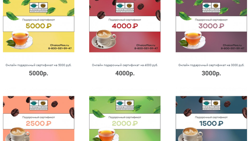 День добрый, уважаемые любители настоящего чая и кофе свежей обжарки. Сегодня хотелось бы поделиться хорошей новостью. По многочисленным просьбам расширили выбор номинала подарочных сертификатов. Перейти к покупке онлайн подарочного сертификата по этой ссылке Онлайн подарочные сертификаты Chaicoffee.ru Подарочный сертификат Chaicoffee.ru - это идеальная форма подарка для любителя кофе или чая. Если вы знаете, что человек, которому вы хотите сделать подарок, любит кофе и чай, но не знаете, какой именно, подарите ему онлайн подарочный сертификат для покупок на сайте Chaicoffee...