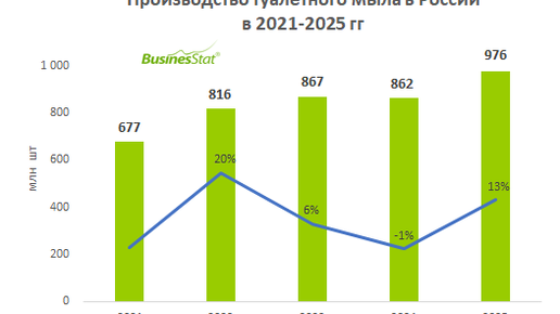 В 2025 г производство туалетного мыла в России выросло на 13%: с 862 до 976 млн усл шт.