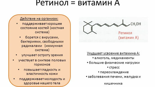 Что такое ретинол и чем он отличается от витамина А Прежде, чем говорить о ретиноле, давайте упорядочим информацию о витамине А. Он незаменим для человеческого организма, участвует в синтезе белков, поддерживает иммунитет и остроту зрения, регулирует обмен веществ. Особенно важно его получать детям, беременным и кормящим женщинам. Он включает в себя 2 группы соединений - ретиноиды и каротиноиды (самым известным из них является β-каротин, 6 мг которого преобразуется в 1 мг витамина А). В группу...