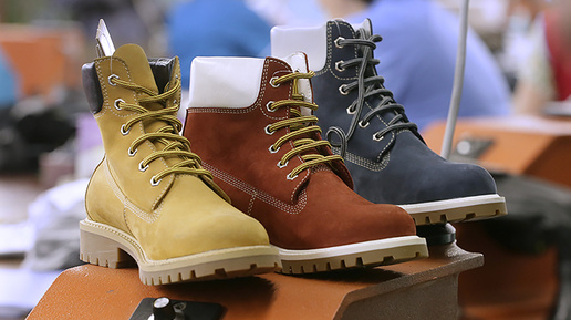 Огромный конвейер с обувью на фабрике RALF RINGER в Москве