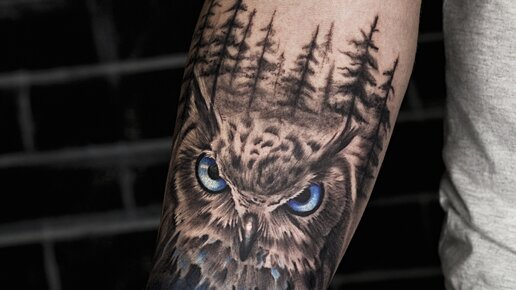 Татуировка Сова на голени женской ноги сделанная в студии Философия тату мастером Юрец Удалец Тату. Разница между тату 10 лет. это целая веха в истории развития мастера