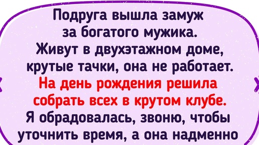 Подруга вышла замуж за богатого мужика. Живут в двухэтажном доме, крутые тачки, она не работает. На день рождения решила собрать всех в крутом клубе. Я обрадовалась, звоню, чтобы уточнить время, а она надменно: «Не помню, тебе говорила или нет, там все будут оплачивать сами — напитки, еду и так далее. Я с мужем поругалась, он денег не дал!» Вот это наглость: притащи подарок, да еще и сам за себя плати. Хорошо, что не успела купить подарок. Больше не общаюсь с ней.  Жутко раздражает, когда стоишь у терминала в фастфуде, а кто-то сзади бесцеремонно уставился в экран и показательно вздыхает...