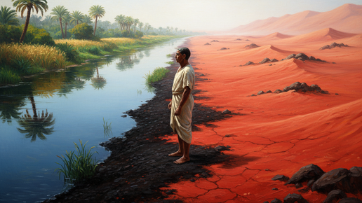 Египтяне смотрели на свою страну и видели две реальности. Чёрная земля — плодородные берега Нила, где колосилась пшеница и зрели финики. И красная земля — пески, уходящие к горизонту без единого признака жизни. Между ними не было плавного перехода. Только граница, резкая как лезвие ножа. Встаньте на этой границе лицом к реке — увидите зелень, услышите голоса, почувствуете влагу. Развернитесь спиной — мёртвая тишина раскалённых дюн. Два мира на расстоянии одного шага. Древний Египет растянулся вдоль Нила в северо-восточной Африке...