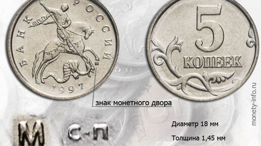 5 копеек - это разменная монета в современной России, выпускаемая с 1997 года. Из-за роста цен на товары и услуги необходимость использования в расчетах 5-копеечных монет снизилась, поэтому с 2014 года такие денежные знаки массово не выпускаются. Найти в обороте монеты мелких номиналов стало почти невозможно. А те, что встречаются, имеют низкую сохранность и не заинтересуют нумизматов. В цене будут только выпуски определенных лет, единичные разновидности и экземпляры с выраженным браком. За все года выпуска характеристики монеты не менялись...
