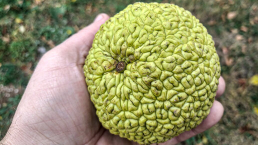 Кому приходилось бывать в Крыму, тот наверняка видел у продавцов всякой курортной экзотики такие вот желтые или зеленые плоды непонятного назначения, диаметром 10-15 см, тяжелые и плотные на ощупь, чем-то напоминающие теннисные мячи. Это и есть маклюра. Я читал, что спелые плоды, созревающие в октябре-ноябре, приобретают оранжевый цвет...