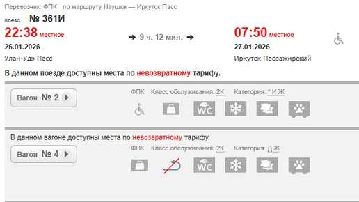 Правда, справедливости ради нужно сказать, что несмотря на якобы статус фирменного поезда (который ему зачем-то Яндекс присвоил), билеты из Иркутска в Улан-Удэ остались на нём по цене обычного поезда Иркутск-Наушки, то есть остались они дешевыми. Вот скрин цены на №361 из Улан-Удэ в Иркутск на 26 января (специально взял такую далекую дату на момент написания статьи - 30 октября 2025 года). Итак - нижняя полка в купе 3220 руб., а верхняя 2375 руб. А вот на 25 января на якобы "Баргузин" №321: Как видим, результат тот же: 3320 / 2375 руб...