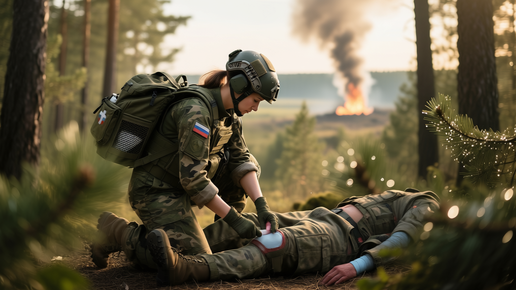 …артиллерии, доносившимся откуда-то из-за леса. Звук был тяжелым, он перекатывался по ночному небу, как отдаленная гроза, но каждый его раскат отзывался в груди холодным предчувствием. А между этими ударами наступала вязкая, давящая тишина, в которой собственное дыхание казалось оглушительным. Раненый на импровизированных носилках тихо стонал, его дыхание срывалось, он жадно хватал ртом воздух, словно тонул в этой неподвижной тьме. Валя то и дело склонялась над ним, нащупывала тонкую ниточку пульса на запястье, поправляла пропитанные кровью повязки...