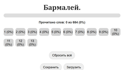 Миг (910). Гриша, читая сегодня "Айболита", сказал: - А после "Айболита" "Бармалей". Эта уникальная способность Гриши страдать, мучаться, но даже сквозь это всё сохранять любопытство, интерес и жажду познания... Сделала ему "Бармалея" (по принципу "Мухи"). По 20 строк на страницу. Без повторов. Получилось 13 страниц. Из всех 684 слов 2 (одно) не прочиталось никак. Хотя иногда оно подсвечивалось, как прочитанное. Как понимаю, распознаватель не понимает, что это за слово. Приложение: Как обычно, рекомендую читать с компьютера и в браузере Chrome...
