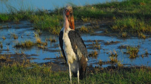 Марабу – это настоящий падальщик, относится к роду птиц из семейства аистовых, один из самых больших среди аистов. Марабу не очень привлекателен, у него лысая шея и большой толстый клюв. Многие считают, что она уродлива и грязная птица. Рост взрослой особи марабу достигает 1.5 метров, а его вес может быть 10 кг. Размах его крыльев достигает трех метров. Самцы и самки практически не различимы, самцы чуть больше самок. Марабу имеют двухцветную окраску, вверху черный окрас, а внизу белый, у основания шеи есть белое пятно...