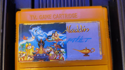 Игра 1 из 300. Управление: Кнопка "А" - бросать яблоки. Они только оглушают крупных противников. Мелких летучих мышей и кувшины убивают. Кнопка "Б" - прыгать и прыгать взбираться. Прыгать можно на головы противника, тем самым избавляясь от них. А так же в прыжке цепляться за разные уступы на зданиях и взбираться на них или раскачиваться для более дальнего прыжка. У игры 7 уровней, начало каждого уровня можно увидеть на фото ниже. Если собрать очень много зелёных (а далее у них и другие цвета) кристаллов, то получаешь 1 жизнь...