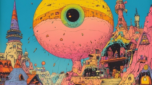 Создано на основе запроса: A colorful, psychedelic cartoon scene of an alien planet with friendly creatures in various costumes and hats celebrating around the base where human-looking aliens live, in the style of Moebius. In the center is one large eyeball that takes up most of the frame. The background shows houses made from different materials like wood, metal, plastic, and fabric. There are also some colorful patterns on cloth hanging from the buildings...