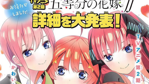 Konnichiwa, мои дорогие читатели) Сегодня я проинформирую вас о выходе второго сезона аниме "5-toubun no Hanayome" (Пять невест) В одном из последних выпусков журнала Shounen Magazine появилась информация, что второй сезон "Пяти невест" начнёт транслироваться в октябре 2020 года. Также появилась информация о смене авторского состава...