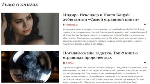 #анонс На страницах октябрьского выпуска журнала DARKER в рубрике «Тьма в книгах» читателей ждут следующие материалы: – Интервью с Анастасией Кацубой и Индирой Искендер – дебютантками серии «Самая страшная книга». Беседовал Артём Агеев; – Статья Сергея Мельника о семи книгах про страшные пророчества; – Рецензия на роман Анджея Сапковского «Перекрёсток воронов»; – Рецензия на роман в рассказах Джеффри Томаса «Монстросити. Панктаун»; – Рецензия на ежегодный сборник рассказов русскоязычных авторов...