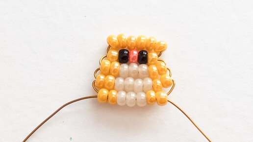 Материалы: чешский бисер №10 желтый, светло-желтый, оранжево-красный, черный, проволока d=2мм 50 см Набираем 7 желтых бисерин, 1 черную, 1 оранжевую, 1 черную, 1 желтую. Проходим вторым концом проволоки навстречу через 1 желтую, 1 черную, 1 оранжевую, 1 черную, 1 желтую. Набираем на один конец проволоки 2 желтые, 3 белые, 2 светло-желтые и проходим вторым концом навстречу. Набираем 2 желтые, 4 светло-желтые, 2 желтые бисерины...