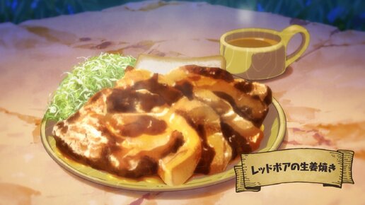 В этот раз Цуёси решил приготовить стейки. Группа авантюристов была в восторге, они и не думали, что жаренное мясо может быть настолько вкусным. Аромат запаха был настолько сильным, что даже волк Фенрир не удержался и пришел на этот запах. Он потребовал, чтобы его тоже накормили. Благодаря этому блюду все остались живы, а Цуёси стал хозяином этого волка в обмен на вкусные обеды. Этот рецепт сочетает в себе сладкий и острый вкусы благодаря имбирю и карамелизованному соусу на мясе. Капуста добавляет свежести и хрустящей текстуры...