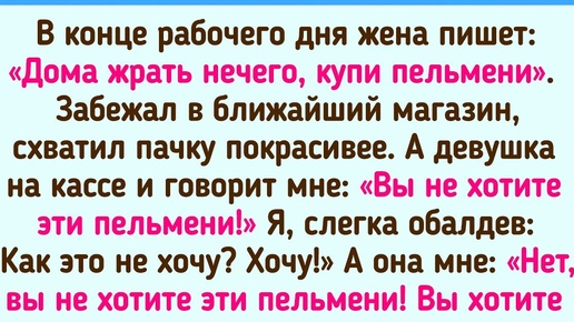 Зашел после работы в магазин за хлебом, подхожу к нужному отделу, а там бабулька крутит-вертит в руках буханку. Через несколько секунд меня увидела и просит: «Сынок, посмотри, дату. Хлеб свежий?» Я проверяю и говорю, мол, сегодня упакован. И тут она выдает: «Ой как хорошо, а то ведь мои куры только свежий клевать любят». В этот момент я забыл, зачем вообще в магазин пришел. В конце рабочего дня жена пишет: «Дома жрать нечего, купи пельмени». Забежал в ближайший магазин, схватил пачку покрасивее...