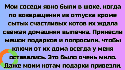 «Ваши рыбки в аквариуме громко топают», «Не щелкайте выключателем», «Хватит парковаться у нас под окнами», — все это не про героев нашей статьи. Им невероятно повезло жить по соседству с понимающими и заботливыми людьми. Они и за котами присмотрят, и нужными инструментами поделятся, и даже диван в общий коридор вынесут...