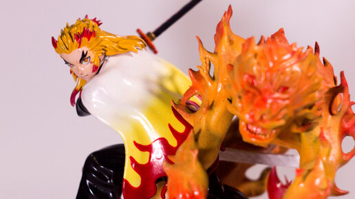 Фигурка Ренгоку выполнена из фотополимерной смолы, подставка из PLA пластика. Окрашивание аэрограф, кисти, глянцевый лак.