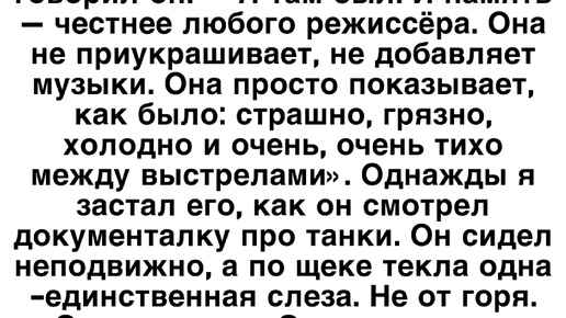 Дед, ветеран, никогда не смотрел военные фильмы. «Зачем? — говорил он. — Я там был. И память — честнее любого режиссёра. Она не приукрашивает, не добавляет музыки...