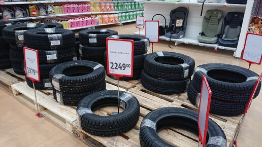 Недавно заглянул в Ашан и оказалось, что там есть вполне вменяемый отдел со всяческими автомобильными "прибамбасами". Другим словом назвать весь ассортимент не получается, так как товары очень разношерстные, и единственное, что их объединяет — это отношение к миру авто. Причем некоторые товары я бы никогда не подумал, что будут продаваться в продуктовом магазине вроде Ашана. Посудите сами. Вот, например, зимняя резина. В продуктовом-то магазине! Ходишь значит по Ашану, выбираешь йогурты, а потом решил комплект тринадцатого диаметра для своей ласточки прикупить...