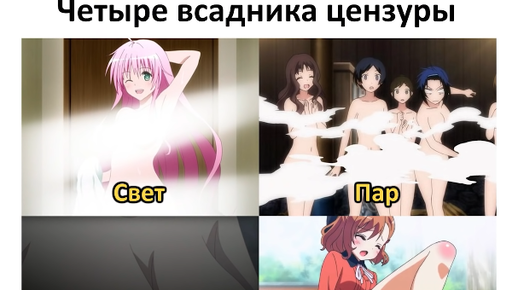 Добро пожаловать! Вы ведь понимаете, что сейчас начнётся? аниме подборка? или может просто красивые аниме арты? Ни то, ни другое. Сейчас начнётся сборка из 11 разных и по-своему прикольных аниме мемов! И сейчас вы посмотрите и скажите "Вот это было весело". Так что вперёд и с песней! 11. Всадники цензуры Вот эти самые "всадники" мешают нам с вами разглядеть, то что мы обычно хотим. И зачем это сделано - непонятно. Но тут действует правило 34. Если есть зацензуренная версия, то где-то гуляет и без цензуры, просто надо хорошо поискать...