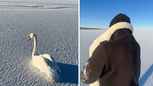 Казахстанец спас двух примерзших лебедей: птица прижалась к нему на руках (ВИДЕО)