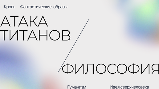 «Атака титанов»- необычное аниме, в котором на фоне ярких и запоминающихся кровопролитием сцен поднимаются вечные темы. Удивительно тонко создатели культовой картины современности совмещают динамичные сражения с тонким психологизмом. В сериале есть рассуждения о свободе, идее сверхчеловека (требует отдельного рассмотрения), смерти, доброте, коллективной ответственности народов за поступки прошлых поколений, дружбе и, главное, цене человеческой жизни. Также авторы рассматривают вопросы утилитаризма, релятивности морали...
