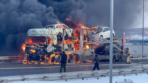 Сегодня, 4 января, под Красноярском загорелась фура, которая перевозит легковые автомобили. На месте работают сотрудники МЧС. Как стало известно «ПМ», все произошло днем на глубоком обходе Красноярска в районе Сухой балки. В МЧС нам пояснили, что сообщение о пожаре поступило им в 13:12. «На место выехали три единицы техники и 12 человек личного состава. Горит автовоз и 8 легковых авто. Площадь пожара 60 квадратных метров». Красноярцы в соцсетях делятся кадрами происшествия. Один из очевидцев рассказал «ПМ», что сначала загорелась фура, от нее огонь перекинулся на машины в полуприцепе...