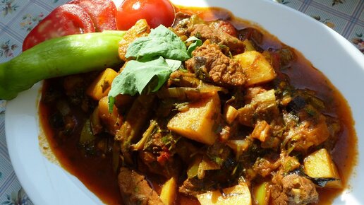 Армянский Бозбаш Ингредиенты :👇 Баранина (на кости (можно заменить на говядину)) — 1-1.5 кг Картофель — 1 кг Баклажан — 2 шт Перец болгарский — 2 шт Помидор — 3 шт Бамия и стручковая фасоль — 300 г Лук репчатый — 2 шт Морковь — 2 шт Масло сливочное — 200 г Чеснок — 6 зубчиков Базилик, кинза — 1 пуч. Соль (по вкусу) Перец острый — небольшой 1 шт Перец черный (горошком)—8 шт Приготовление:😄 1. Баранину промываем, кладем в холодную воду и ставим на огонь. В тоже время режем кружочками баклажаны и присыпаем солью (чтобы вышла горечь)...