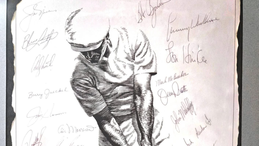 Перед вами — по-настоящему редкий коллекционный предмет: художественный скетч Бена Хогана в момент удара (impact position), подписанный в 1979 году на турнире Tournament of Champions в Ла Коста, Калифорния. Работа была также передана в офис самого мистера Хогана, где он лично поставил свою подпись. Все автографы прошли сертификацию подлинности. Этот экземпляр объединяет подписи выдающихся игроков эпохи: • Джек Никлаус • Брюс Литцке • Энди Норт • Барри Джекел • Джим Саймонс • Гил Морган • Гэри Плейер...