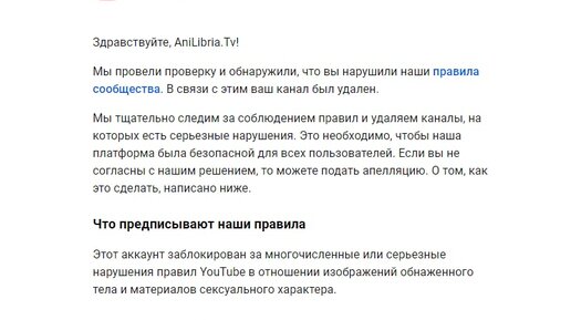 Друзья, помните нам взломали стрим и запустили там по***ху? Мы быстро это удалили, Ютуб это, вроде бы, не заметил, всё было хорошо. Теперь, вдруг, спустя 2 дня — канал просто удалён. Скорее всего, те уроды, которые взломали канал — подали тогда же в поддержку Ютуба жалобы. И Ютуб, проснувшись в понедельник, просто, без разговоров и предупреждений — удалил наш канал. Конечно, я подал апелляцию, но шансы наши 50 на 50. Если честно, я в шоке. Понятно, что трансляция с по***хой это жесть и полное нарушение правил...
