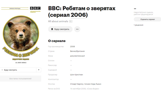 Задалась вопросом, какими познавательными фильмами разбавить мультики ребёнку. А т.к. телевизора у нас уже больше 10 лет нет, то каналы типа Дискавери тоже отсутствуют. Пошла по любимому пути – искать в интернете ответы :) Он гуляет в сети под разными названиями. Даже Кинопоиск выдал его как "Ребятам о зверятах", полагаю из-за того, что именно так назвался DVD диск на русском (фото в карусели, листайте ->) Наткнулась на него случайно на Ютьюбе в чьём-то плейлисте. Очень понравилось, что рассказывают...