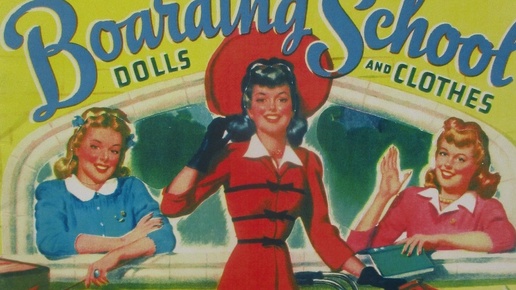 Передняя обложка набора. Покажу набор под названием "Школа-интернат". Наборчик очень большой, состоит аж из шести кукол-девушек. Одежда для них прилагается на восьми листах. Мои бумажные куклы являются более поздним переизданием, к сожалению, год не указан. Первое издание этого набора было выпущено издательством "Merrill" в 1942-м году. И надо сказать, что его невозможно приобрести, так как цены почему-то подняты до баснословных размеров, от восьмидесяти долларов...