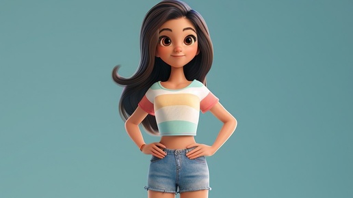 Создано на основе запроса: 3D cartoon character turnaround, full body, stylized female character with exaggerated proportions (slim waist, long legs, big eyes, small nose), clean Disney-Pixar style, soft lighting, high detail, glossy textures, pastel background, character wearing modern casual outfit, jeans or shorts, striped or colorful top, friendly expression, charming and youthful look --- Автоперевод: Трехмерный мультипликационный персонаж. Обработка персонажа,...