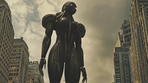 Создано на основе запроса: fantasy goddess, fantasy story goddess, goddess of cities, full body shot | tall, giant woman, towering over city, perfect posture, 1940s art deco aesthetic | muscular, tall, skin of black obsidian glass, glass skin, concrete clothing, rebar steel hair | giant humanoid skyscraper, 1940s...