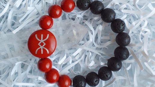 Браслет состоит из натуральных камней красной яшмы, вулканической лавы и руны «Достаток».