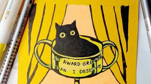 Показываю процесс создания этой иллюстрации — от идеи до финала. Этапы работы: 1️⃣ Сначала — быстрые карандашные эскизы. Ищу форму кубка и характер кота, пробую композицию. 2️⃣ Переношу финальный эскиз на тонированную бумагу, намечаю основные линии очень легко. 3️⃣ Обвожу рисунок чёрной тушью: силуэт, детали, надпись, фоновые линии...
