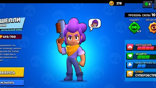 Привет всем. Шелли - базовый персонаж игры бравл старс, который доступен всем с самого начала. Является бойцом средней дистанции с атакой по сектору, среднем запасом здоровья и высоким уроном. Так ли это? Разберём подробнее. На самом деле, хоть бравлер и имеет рендж атаку, она является бойцом ближнего боя и никак иначе. Только в ближнем бою ваши соперники познают истинную боль и беспомощность. При виде вас новички обращаются в бегство, опытные игроки держутся стороной, а глупцы находятся в поиске новой игры...