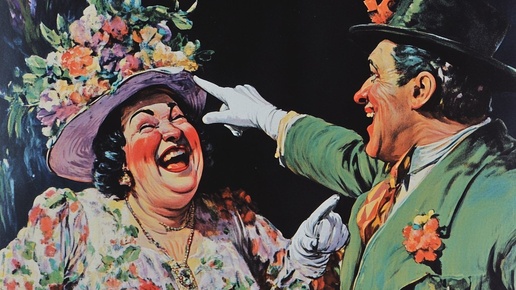 Создано на основе запроса: a photo of a vintage joke greeting card that says "Happy March 32nd!" with a 1930s cartoon of a joker pointing and laughing at a fat old woman dressed in a fancy hat, floral dress, and white gloves...