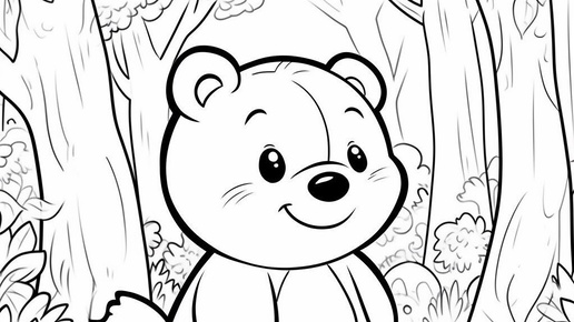 Создано на основе запроса: Adorable cartoon bear in a forest, a black and white Pixar-style coloring illustration