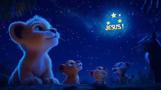 Создано на основе запроса: 3d cartoon animation The lion cub and his friends look up at the night sky filled with stars. The scene zooms out to show Jesus holding the world in His hands as the animals cheer, saying, "JESUS!" --- Автоперевод: 3D Cartoon Animation...