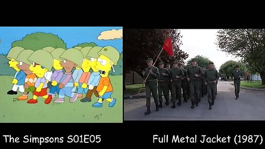 В чём секрет популярности мультсериала The Simpsons ? Кроме искрометных шуток на злобу дня , возможно скрытые и не очень пародии на знаменитые фильмы, сериалы, и другие мультфильмы. Вот например сцена из пятого эпизода первого сезона где Барт марширует со своей детской армией , отсылка фильму Стэнли Кубрика -Цельнометалли́ческая оболо́чка. В четвёртой эпизоде второго сезона была отсылка к фильму Орсона Уэллса-Гражданин Кейн...