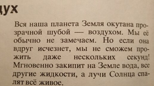 Вся наша планета Земля окутана прозрачной шубой — воздухом. Мы её обычно не замечаем. Но если она вдруг исчезнет, мы не сможем прожить даже нескольких секунд! Мгновенно закипит на Земле вода, все другие жидкости, а лучи Солнца спалят всё живое...