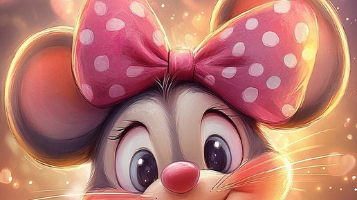 Создано на основе запроса: A cute cartoon mouse character inspired by classic animation style, wearing a pink polka-dotted dress and a matching large bow, kneeling with a cheerful expression. The character is set against a dreamy, colorful background filled with soft, glowing hearts and bokeh lights in shades of pink, purple, and gold. The style is highly detailed,...